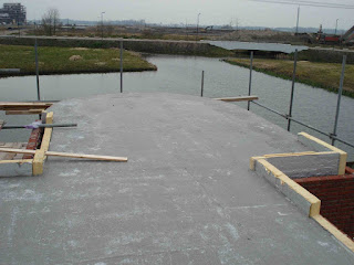 Vanmiddag met Nicole even gaan kijken. De metselaars zijn momenteel even ergens anders want afgelopen week is er beton gestort op de 1e verdiepingvloer. Het metselwerk is gereed tot aan de 1e verdieping dus voor hen is er momenteel niets te doen. Fred was er natuurlijk wel met zijn assistent en te samen waren ze kozijnen aan het stellen op de 1e verdieping. Het gaat nu weer op dezelfde volgorde als op de begane grond. De kozijnen worden gesteld, dan komen a.s. donderdag de metselaars weer terug om te beginnen met de binnen muren opmetselen, en daarna de buiten muren.